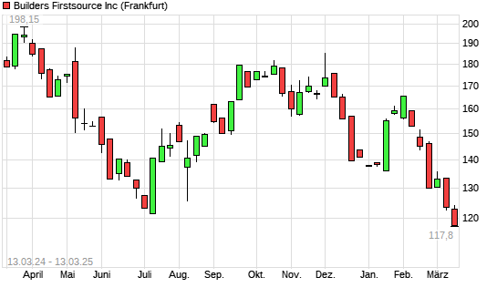 Mit dem Rücksetzer auf 118,95 EUR hat die Builders Firstsource-Aktie (ISIN US12008R1077) am 12.03.2025 ein neues 12-Monats-Tief erreicht und damit den Kurs vom 05.03.2025 eingestellt.