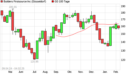 Mit dem Rücksetzer auf 159,20 EUR hat die Builders Firstsource-Aktie am 03.02.2025 die 100-Tage-Linie nach unten gekreuzt.