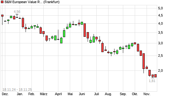 Mit dem Rücksetzer auf 1,82 EUR hat die B&M European Value Retail Ord-Aktie (ISIN LU1072616219) am 17.11.2025 ein neues All-Time-Low erreicht und damit den Kurs vom 14.11.2025 eingestellt.
