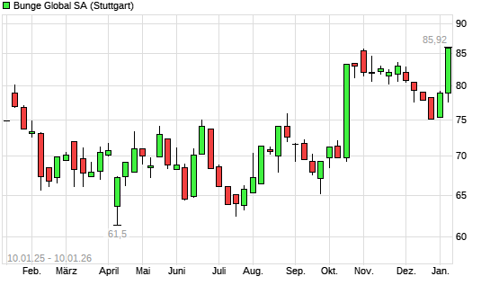 Mit dem Anstieg auf 85,38 EUR hat die Bunge-Aktie (ISIN CH1300646267) am 09.01.2026 ein neues 12-Monats-Hoch erreicht und damit den Kurs vom 24.10.2025 eingestellt.