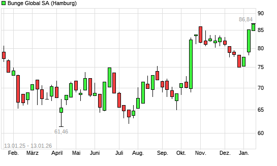 Mit dem Anstieg auf 86,26 EUR hat die Bunge-Aktie (ISIN CH1300646267) am 12.01.2026 ein neues 12-Monats-Hoch erreicht und damit den Kurs vom 09.01.2026 eingestellt.