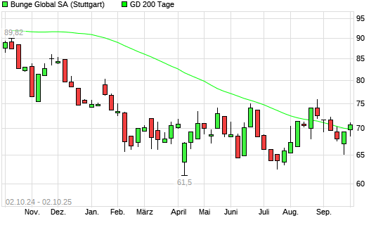 Mit dem Anstieg auf 69,92 EUR hat die Bunge-Aktie am 01.10.2025 die 200-Tage-Linie nach oben gekreuzt.