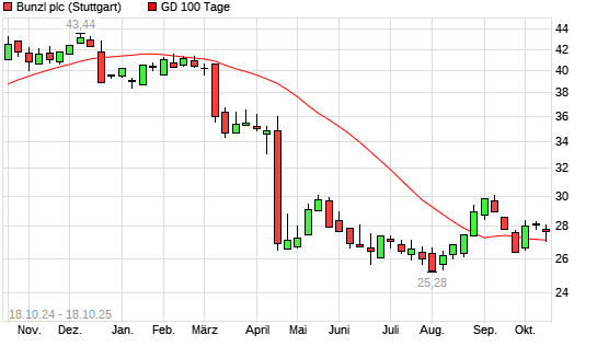 Mit dem Rücksetzer auf 27,54 EUR hat die Bunzl-Aktie am 17.10.2025 die 100-Tage-Linie nach unten gekreuzt.