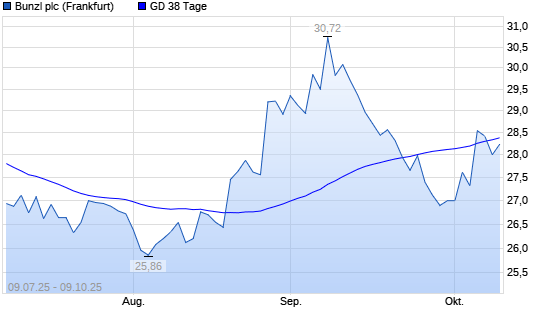 Mit dem Rücksetzer auf 28,00 EUR hat die Bunzl-Aktie am 08.10.2025 die 38-Tage-Linie nach unten gekreuzt.