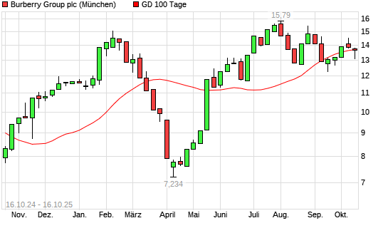 Mit dem Anstieg auf 14,09 EUR hat die Burberry Group-Aktie am 15.10.2025 die 100-Tage-Linie nach oben gekreuzt.