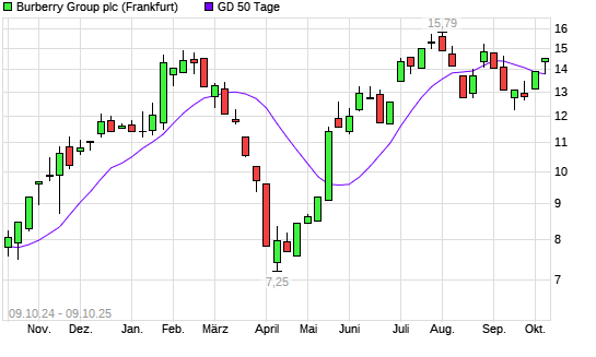 Mit dem Anstieg auf 14,43 EUR hat die Burberry Group-Aktie am 08.10.2025 die 50-Tage-Linie nach oben gekreuzt.