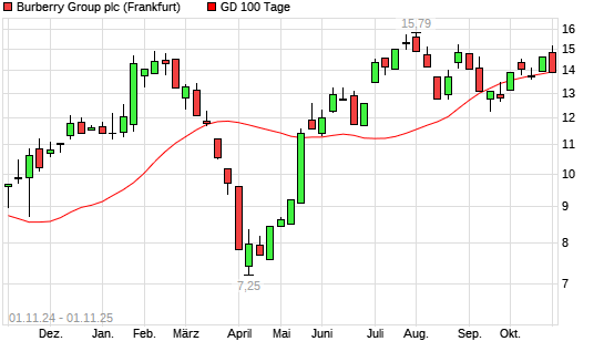 Mit dem Rücksetzer auf 13,93 EUR hat die Burberry Group-Aktie am 31.10.2025 die 100-Tage-Linie nach unten gekreuzt.