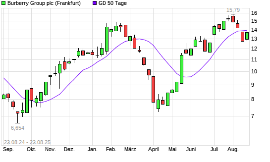Mit dem Rücksetzer auf 13,72 EUR hat die Burberry Group-Aktie am 22.08.2025 die 50-Tage-Linie nach unten gekreuzt.