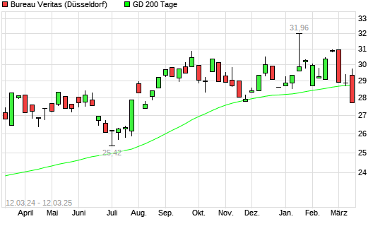 Mit dem Rücksetzer auf 28,10 EUR hat die Bureau Veritas-Aktie am 11.03.2025 die 200-Tage-Linie nach unten gekreuzt.