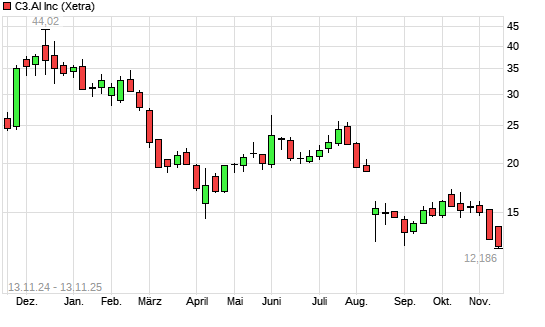 Mit dem Rücksetzer auf 12,73 EUR hat die C3.ai-Aktie (ISIN US12468P1049) am 12.11.2025 ein neues 12-Monats-Tief erreicht und damit den Kurs vom 07.11.2025 eingestellt.