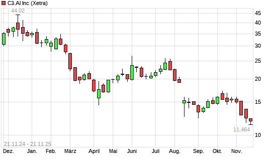 Mit dem Rücksetzer auf 11,21 EUR hat die C3.ai-Aktie (ISIN US12468P1049) am 20.11.2025 ein neues 12-Monats-Tief erreicht und damit den Kurs vom 17.11.2025 eingestellt.