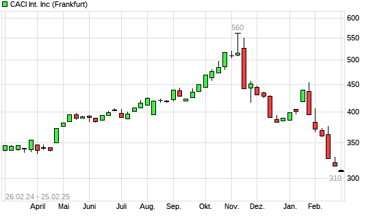 Mit dem Rücksetzer auf 310,00 EUR hat die CACI International-Aktie (ISIN US1271903049) am 24.02.2025 ein neues 12-Monats-Tief erreicht und damit den Kurs vom 21.02.2025 eingestellt.