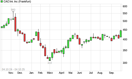 Mit dem Anstieg auf 446,40 EUR hat die CACI International-Aktie (ISIN US1271903049) am 03.10.2025 ein neues 6-Monats-Hoch erreicht und damit den Kurs vom 02.10.2025 eingestellt.