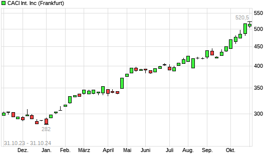 Mit dem Anstieg auf 520,50 EUR hat die CACI International-Aktie (ISIN US1271903049) am 30.10.2024 ein neues All-Time-High erreicht und damit den Kurs vom 25.10.2024 eingestellt.