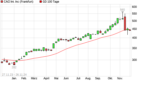 Mit dem Rücksetzer auf 446,00 EUR hat die CACI International-Aktie am 25.11.2024 die 100-Tage-Linie nach unten gekreuzt.