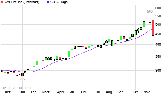 Mit dem Rücksetzer auf 468,60 EUR hat die CACI International-Aktie am 14.11.2024 die 50-Tage-Linie nach unten gekreuzt.