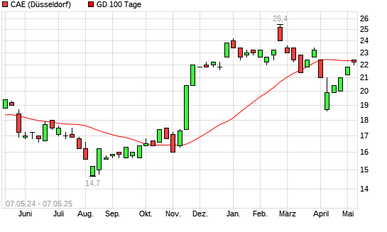 Mit dem Rücksetzer auf 22,20 EUR hat die CAE-Aktie am 06.05.2025 die 100-Tage-Linie nach unten gekreuzt.