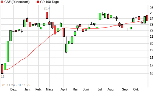 Mit dem Rücksetzer auf 23,80 EUR hat die CAE-Aktie am 31.10.2025 die 100-Tage-Linie nach unten gekreuzt.