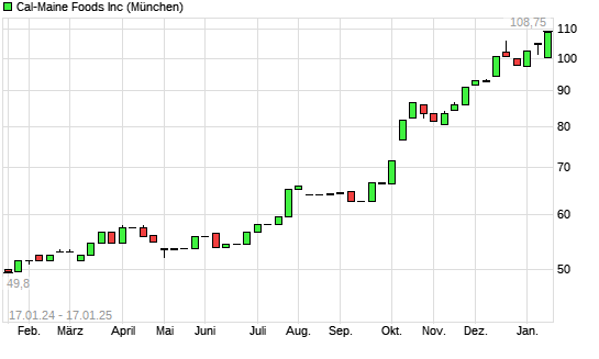 Mit dem Anstieg auf 108,65 EUR hat die CAL-MAINE FOODS-Aktie (ISIN US1280302027) am 16.01.2025 ein neues All-Time-High erreicht und damit den Kurs vom 16.12.2024 eingestellt.
