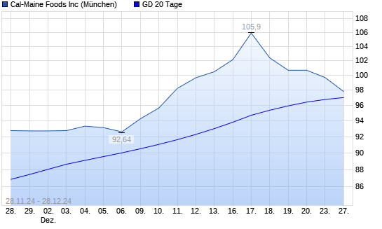 Mit dem Rücksetzer auf 97,26 EUR hat die CAL-MAINE FOODS-Aktie am 27.12.2024 die 20-Tage-Linie nach unten gekreuzt.