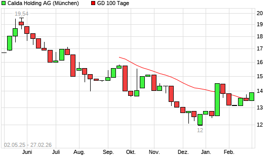 Mit dem Anstieg auf 14,00 EUR hat die CALIDA Holding NA-Aktie am 26.02.2026 die 100-Tage-Linie nach oben gekreuzt.