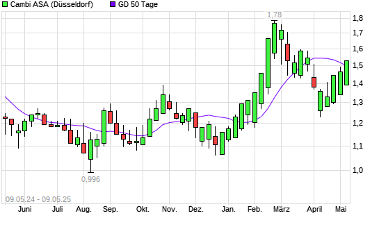 Mit dem Rücksetzer auf 1,45 EUR hat die CAMBI ASA-Aktie am 08.05.2025 die 50-Tage-Linie nach unten gekreuzt.