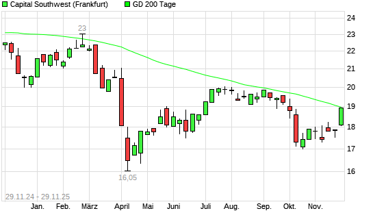 Mit dem Anstieg auf 18,93 EUR hat die CAPITAL SOUTHWEST CORPORATION-Aktie am 28.11.2025 die 200-Tage-Linie nach oben gekreuzt.Die CAPITAL SOUTHWEST CORPORATION-Aktie befand sich seit dem 20.02.2025 ...weiterlesen