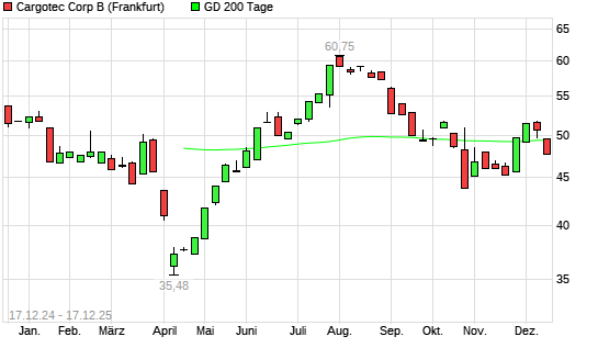 Mit dem Rücksetzer auf 48,68 EUR hat die CARGOTEC B-Aktie am 16.12.2025 die 200-Tage-Linie nach unten gekreuzt.