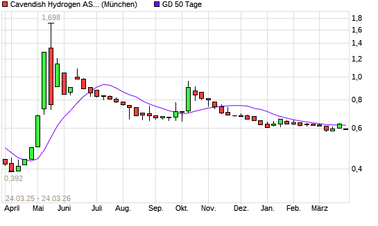 Mit dem Rücksetzer auf 0,59 EUR hat die CAVENDISH HYDROGEN-Aktie am 23.03.2026 die 50-Tage-Linie nach unten gekreuzt.