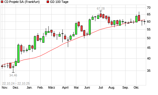 Mit dem Anstieg auf 60,76 EUR hat die CD Projekt-Aktie am 21.10.2025 die 100-Tage-Linie nach oben gekreuzt.