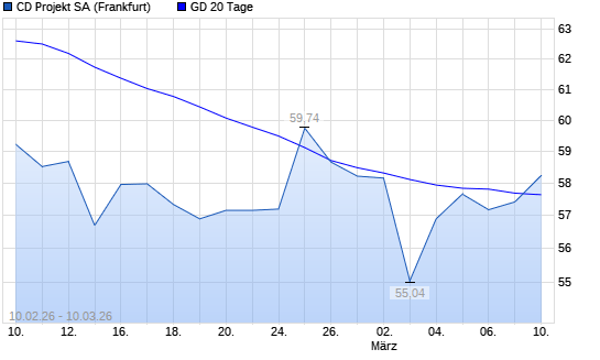 Mit dem Anstieg auf 57,78 EUR hat die CD Projekt-Aktie am 09.03.2026 die 20-Tage-Linie nach oben gekreuzt.