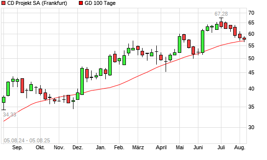 Mit dem Rücksetzer auf 56,28 EUR hat die CD Projekt-Aktie am 04.08.2025 die 100-Tage-Linie nach unten gekreuzt.