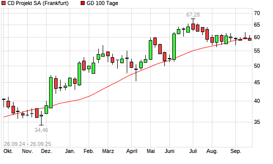 Mit dem Rücksetzer auf 59,02 EUR hat die CD Projekt-Aktie am 25.09.2025 die 100-Tage-Linie nach unten gekreuzt.