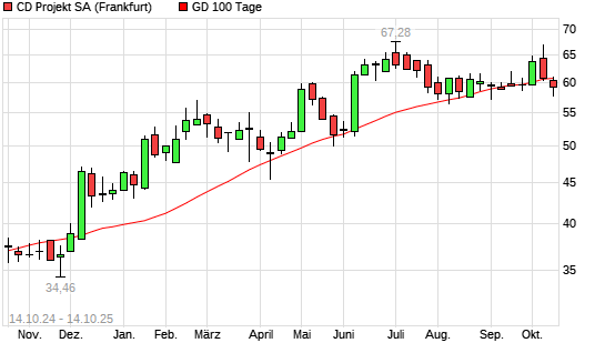 Mit dem Rücksetzer auf 58,62 EUR hat die CD Projekt-Aktie am 13.10.2025 die 100-Tage-Linie nach unten gekreuzt.