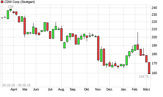 Mit dem Rücksetzer auf 161,30 EUR hat die CDW Corporation-Aktie (ISIN US12514G1085) am 04.03.2025 ein neues 12-Monats-Tief erreicht und damit den Kurs vom 19.11.2024 eingestellt.