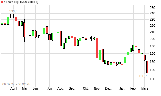 Mit dem Rücksetzer auf 159,45 EUR hat die CDW Corporation-Aktie (ISIN US12514G1085) am 05.03.2025 ein neues 12-Monats-Tief erreicht und damit den Kurs vom 04.03.2025 eingestellt.