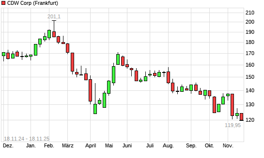 Mit dem Rücksetzer auf 120,40 EUR hat die CDW Corporation-Aktie (ISIN US12514G1085) am 17.11.2025 ein neues 3-Jahres-Tief erreicht und damit den Kurs vom 04.11.2025 eingestellt.