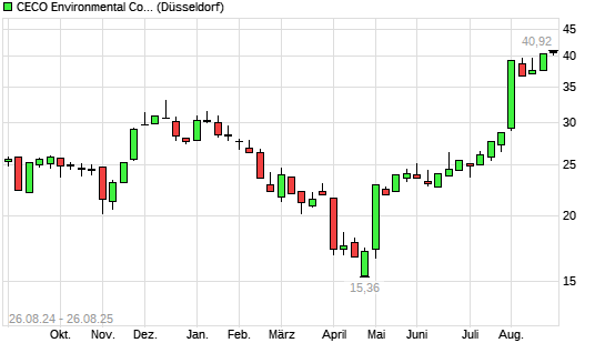 Mit dem Anstieg auf 40,44 EUR hat die CECO Environmental-Aktie (ISIN US1251411013) am 25.08.2025 ein neues All-Time-High erreicht und damit den Kurs vom 22.08.2025 eingestellt.