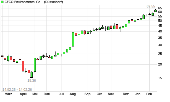 Mit dem Anstieg auf 66,05 EUR hat die CECO Environmental-Aktie (ISIN US1251411013) am 13.02.2026 ein neues All-Time-High erreicht und damit den Kurs vom 11.02.2026 eingestellt.
