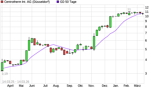 Mit dem Rücksetzer auf 10,70 EUR hat die CENTROTHERM PHOTOV.KONV.-Aktie am 13.03.2026 die 50-Tage-Linie nach unten gekreuzt.
