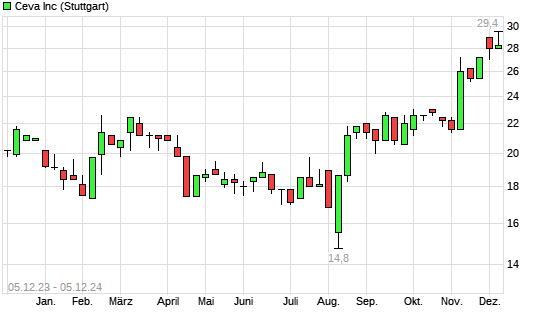 Mit dem Anstieg auf 29,40 EUR hat die CEVA-Aktie (ISIN US1572101053) am 04.12.2024 ein neues 12-Monats-Hoch erreicht und damit den Kurs vom 25.11.2024 eingestellt.