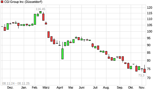 Mit dem Rücksetzer auf 73,38 EUR hat die CGI Group-Aktie (ISIN CA12532H1047) am 07.11.2025 ein neues 3-Jahres-Tief erreicht und damit den Kurs vom 17.10.2025 eingestellt.