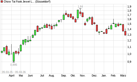Mit dem Rücksetzer auf 1,29 EUR hat die CHOW TAI FOOK JEWEL.-Aktie (ISIN KYG211461085) am 04.03.2026 ein neues 6-Monats-Tief erreicht und damit den Kurs vom 18.12.2025 eingestellt.