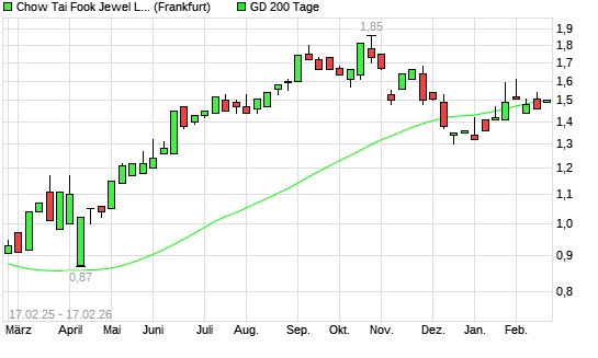 Mit dem Anstieg auf 1,49 EUR hat die CHOW TAI FOOK JEWEL.-Aktie am 16.02.2026 die 200-Tage-Linie nach oben gekreuzt.