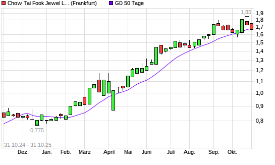 Mit dem Rücksetzer auf 1,66 EUR hat die CHOW TAI FOOK JEWEL.-Aktie am 30.10.2025 die 50-Tage-Linie nach unten gekreuzt.