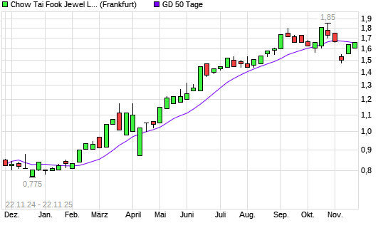 Mit dem Rücksetzer auf 1,64 EUR hat die CHOW TAI FOOK JEWEL.-Aktie am 21.11.2025 die 50-Tage-Linie nach unten gekreuzt.