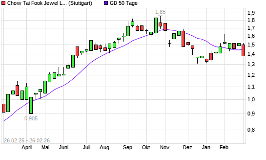 Mit dem Rücksetzer auf 1,44 EUR hat die CHOW TAI FOOK JEWEL.-Aktie am 25.02.2026 die 50-Tage-Linie nach unten gekreuzt.