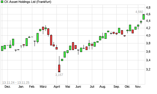 Mit dem Anstieg auf 4,59 EUR hat die CK Asset Holdings-Aktie (ISIN KYG2177B1014) am 12.11.2025 ein neues 12-Monats-Hoch erreicht und damit den Kurs vom 11.11.2025 eingestellt.