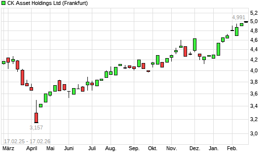 Mit dem Anstieg auf 4,98 EUR hat die CK Asset Holdings-Aktie (ISIN KYG2177B1014) am 16.02.2026 ein neues 12-Monats-Hoch erreicht und damit den Kurs vom 13.02.2026 eingestellt.