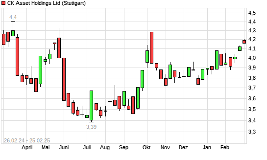 Mit dem Anstieg auf 4,23 EUR hat die CK Asset Holdings-Aktie (ISIN KYG2177B1014) am 24.02.2025 ein neues 6-Monats-Hoch erreicht und damit den Kurs vom 21.02.2025 eingestellt.